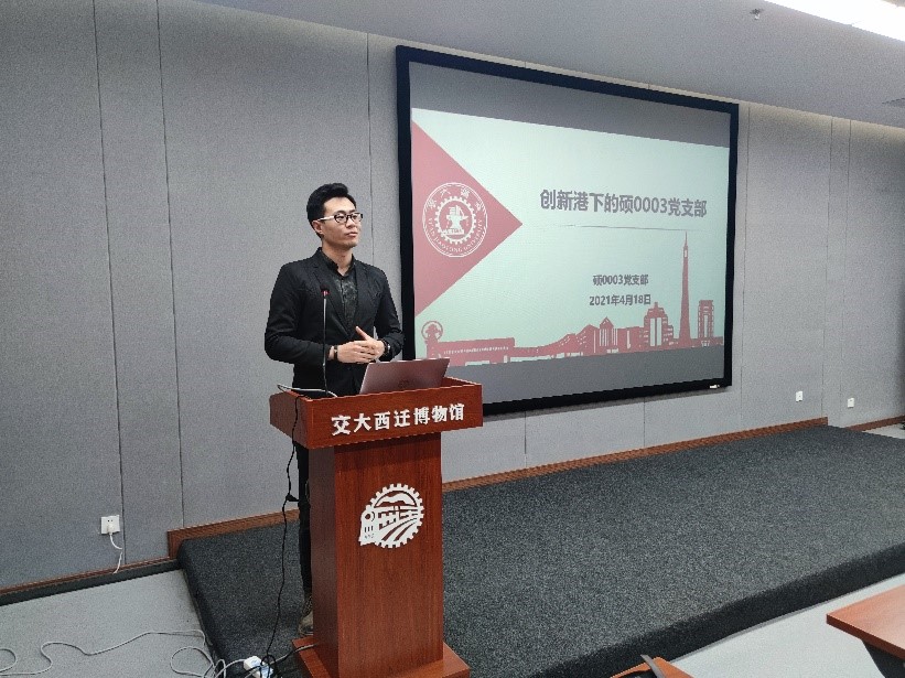 随后机械学院硕0003党支部书记李希晨介绍了创新港以及高端装备研究院的基本情况,期待本科生同学以后来到创新港,并对硕0003党支部的基本情况、思想建设活动等进行了介绍。