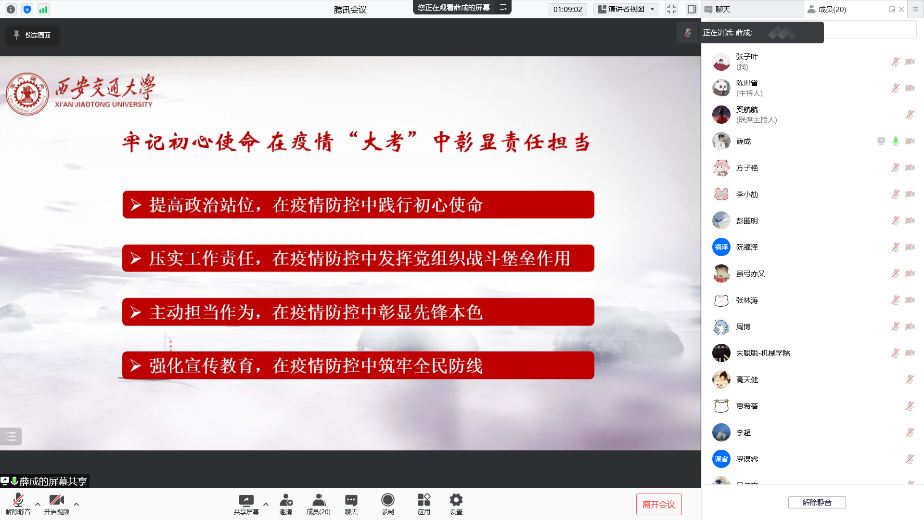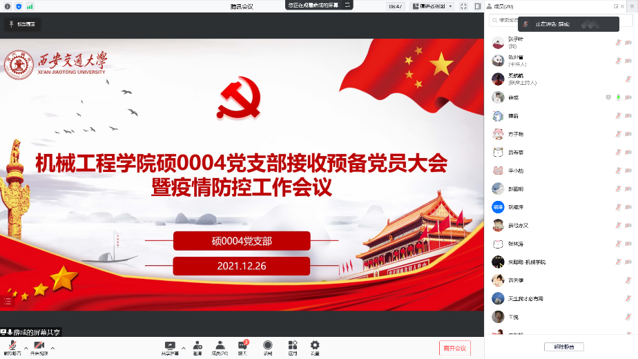 根据硕0004党支部发展党员工作计划,经征求党员和群众意见、支部委员会审查同意,12月26日晚,凯发最新登录网站硕0004党支部线上召开接收预备党员大会。同时,针对近期西安日趋严峻的疫情防控态势,党支部根据学校、学院要求,向与会成员传达学校、学院疫情防控工作会议精神,部署安排支部内疫情防控工作。