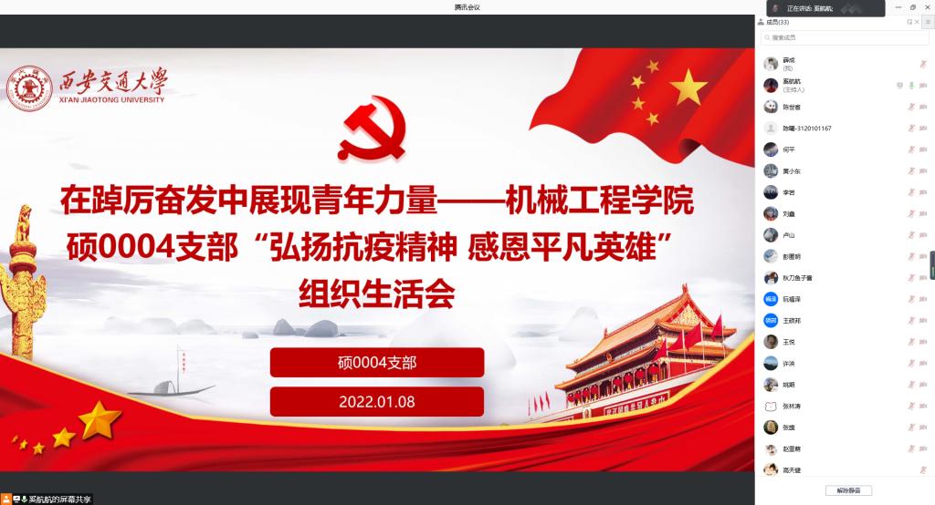 岁末年初,一场突如其来、态势凶猛的新冠肺炎疫情阴影笼罩三秦大地。面对疫情,西安人民站在一起、心手相连、同舟共济、共同坚守、全力应对。为致敬这些奋战一线可爱可敬的无名英雄们,同时发扬我校学子“饮水思源”的优良传统,1月8日,凯发最新登录网站硕0004党团支部召开线上组织生活会,弘扬抗疫精神,感恩平凡英雄,号召全体同学以青春践行使命担当。