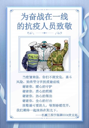 疫情之下,危难时刻,我们看到了党员、职工挺身一线、昼夜奋战的感人身影,也看到了广大校友向交大伸出的援助之手,点点滴滴汇聚成交大人同心抗疫的磅礴力量。会议结束后,支部同学纷纷留言,向所有奋战在一线的抗疫工作人员致敬,并制作感恩贺卡,用画笔细细勾勒,用文字将感恩之情倾注于笔端、传递至心中,真诚地向所有的抗疫英雄说一句“辛苦”、道一声“感谢”。
