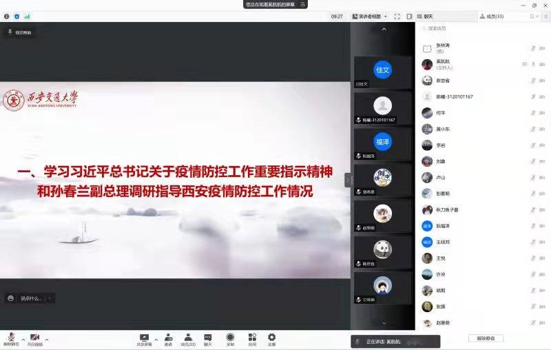 首先,组织委员奚航航同学带领大家学习领会了总书记关于疫情防控工作的重要指示精神和孙春兰副总理调研指导西安疫情防控工作情况,呼吁支部党员、团员发挥好带头作用,守土有责、守土尽责,坚定信心,同舟共济,及时提醒身边同学配合防疫工作,妥善处理好疫情防控中出现的各类矛盾和问题,坚决打赢疫情防控阻击战。