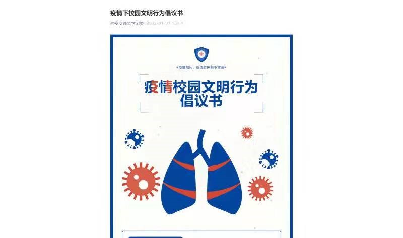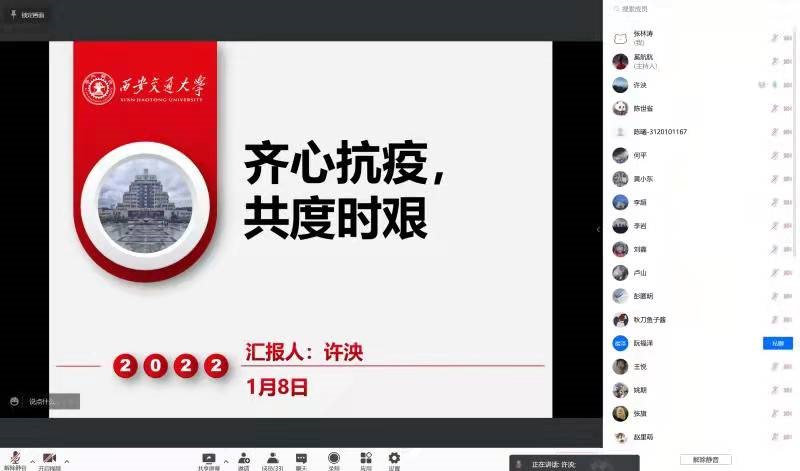 疫情仍在持续,防控工作依旧胶着,为了巩固扩大来之不易的防控成效,维护交大文明校园,支部纪检委员陈世省同学向大家宣读了疫情校园文明行为倡议书,从党员主动作为到师生文明购餐,保持宿舍卫生到依规检测核酸,健康生活学习到保持乐观心态等多方面发起倡议,希望同学们共同行动,为早日打赢疫情防控阻击战贡献力量。