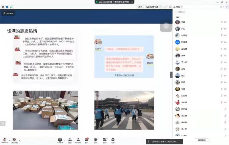 在这场疫情中,无数的抗疫力量涌现出来,共同发力,帮助我们度过难关。赵里萌同学向大家介绍了政府、社会、学校的多方面举措,希望大家能够铭记援助之手,心怀感恩之情。面对变种病毒,政府开展大规模核酸检测,加强重点区域防控,同时调配生活物资,保证民生供应;以市政府、企业和个人为代表的社会力量进行物资捐赠,为西安抗疫汇集力量;校园里,党员干部、辅导员和学生志愿者,各出其力,各展所长,保障师生基本正常生活。没有一个冬天不可逾越,希望我们共同携手,期待春天的到来。朱新凯同学表示,我们要弘扬伟大抗疫精神,增强抗击疫情的精神力量。同时他还赋诗《长安一疫》,表达对各行各业抗疫英雄的感恩之情以及战胜疫情的坚定信心。