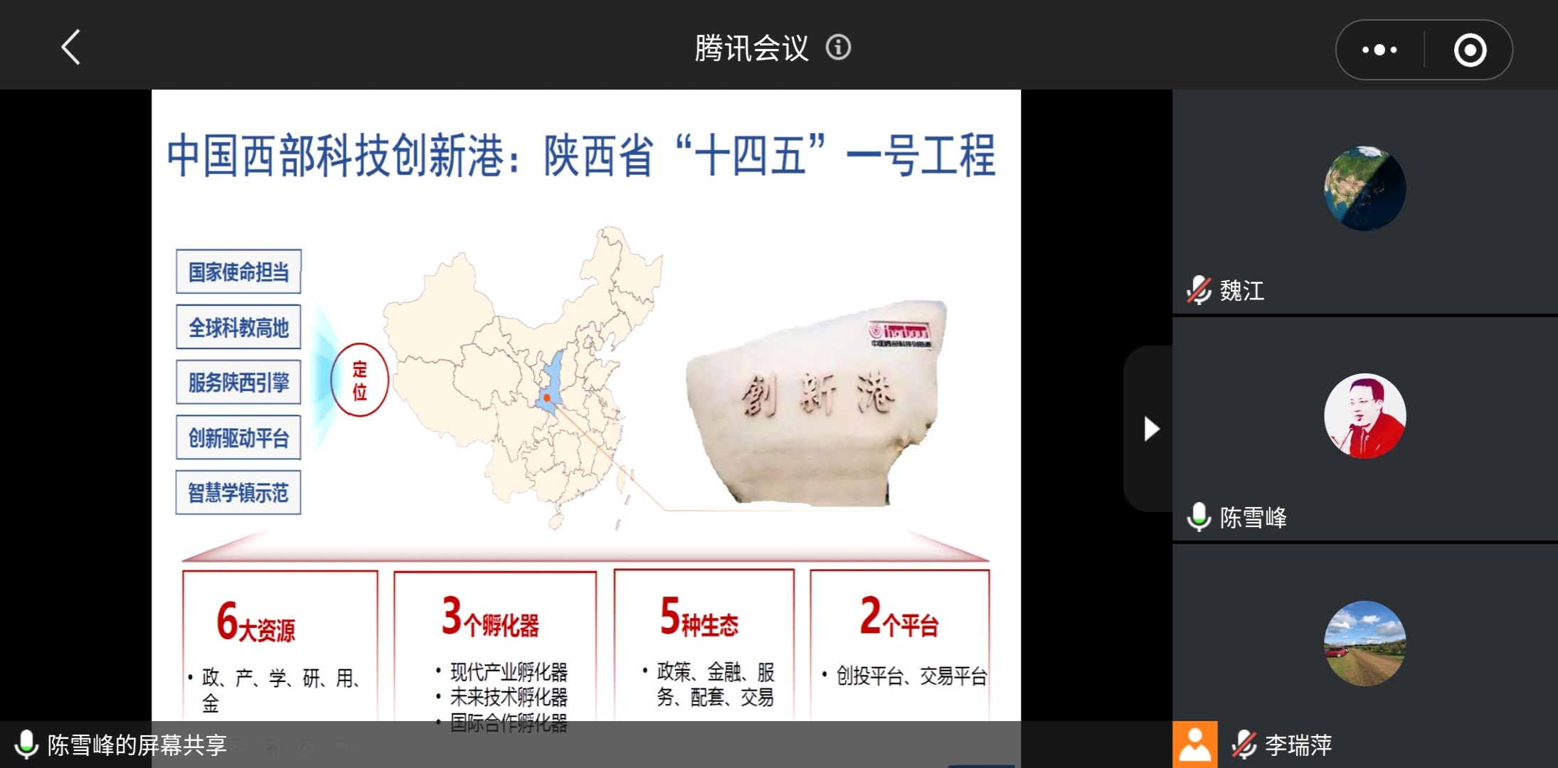 随后,陈雪峰院长重点介绍了学校依托中国西部科技创新港推进“6352”工程的实质内涵,即深入学习贯彻习近平总书记来陕考察重要讲话精神,依托中国西部科技创新港推进实施“6352”工程,“政产学研用金”6进创新港;通过建设现代产业学院、未来技术学院、丝路国际学院3个学院(孵化器),实现人才培养模式变革;营造“政策、金融、服务、配套、交易”5大生态,打造“创投、交易”2个支撑平台,探索产学研深度融合有效举措、创新路径,聚力将创新港打造成为陕西最大的孵化器和科技成果转化“特区”。陈院长表示:“要保持战略定力,创新港是学校发展重要战略与契机”。