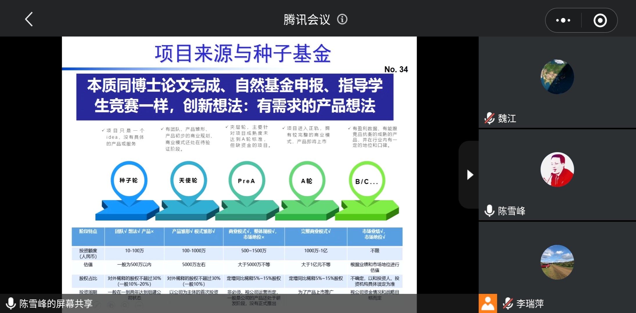 陈院长还介绍了种子基金项目来源、遴选程序、资金来源、成果转化途径等,以及为创新港产研合作人才培养与科技成果转化提供的“政策、金融、服务、配套、交易”条件保障等措施。他指出,种子基金助力青年教师起跑,鼓励广大青年教师要创新想法积极申请种子基金项目,同时勉励青年教师要面向未来、爱国奋斗、多源发展、言传身教培养英才。