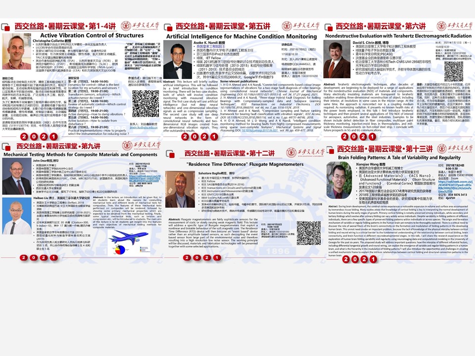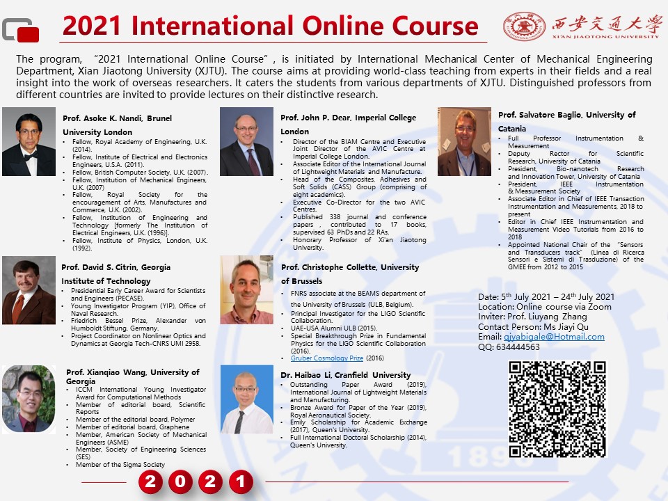 由凯发最新登录网站国际机械中心举办的2021西安凯发最新登录网站西交丝路云课堂暑期国际课程于2021年7月24日圆满落幕,该课程共13讲,内容涵盖了振动主动控制、人工智能故障诊断、太赫兹检测、结构与功能性复合材料、高性能传感器设计与应用、大脑皮层褶皱结构与大脑功能耦合规律等,邀请了包括英国皇家工程院院士Asoke K. Nandi教授在内的英国、比利时、意大利、美国等7位专家学者,线上累计参与课程人数达655人次。