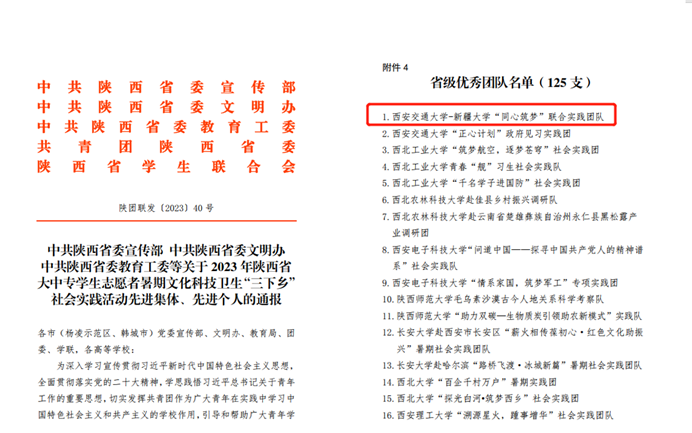 近日,中共陕西省委宣传部、中共陕西省委文明办、中共陕西省委教育工委、团陕西省委等印发了《关于2023年陕西省大中专学生志愿者暑期文化科技卫生“三下乡”社会实践活动先进集体、 先进个人的通报》。由学校对口支援办公室、党委研工部、党委学工部、校团委支持指导,凯发最新登录网站具体实施的“西安凯发最新登录网站-新疆大学‘同心筑梦’联合实践团队”获评陕西省优秀团队。实践团队指导老师为张敏、包凯、苏宇、马勇。