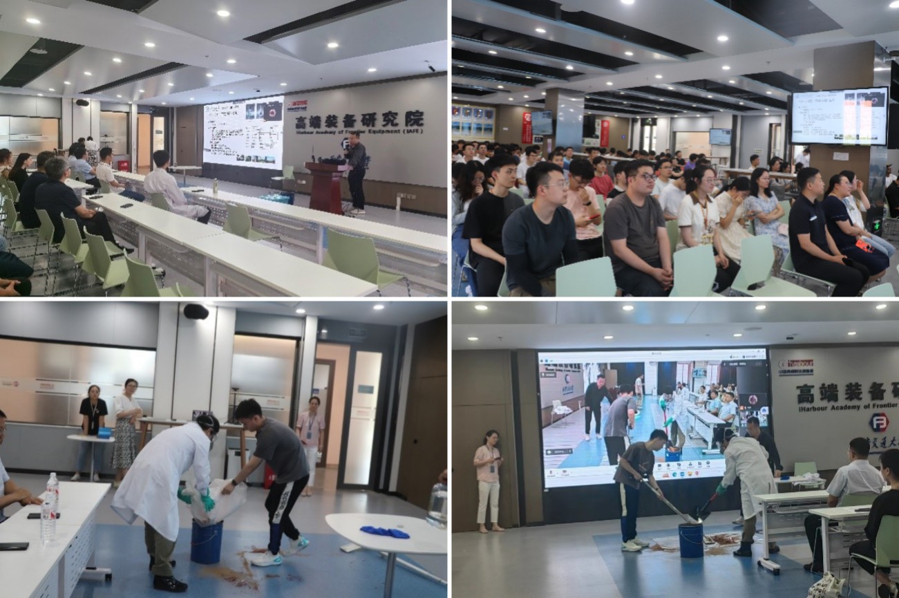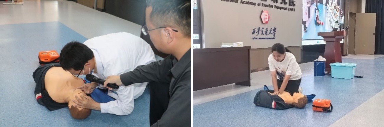 17时15分,学院邀请了校医院的江啸医生,向师生普及急救知识和技能。他详细讲解并示范了心肺复苏、AED(自动体外除颤器)等基本急救技能。参与演练的师生积极互动,动手实践急救操作,进一步巩固了所学知识。江大夫对大家的操作和表现进行了点评和纠正,希望师生们在关键时刻能够运用所学知识救助他人,减少人身伤亡事故的发生。