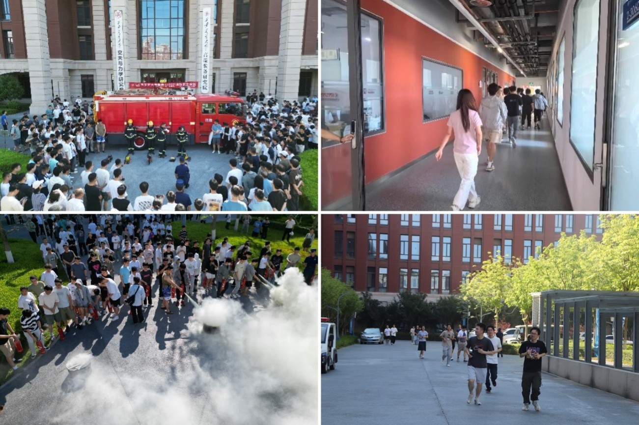 16时,消防疏散演练正式开始。演练场景模拟某实验室因电器线路短路引起火灾,火势整楼蔓延、消防通道被烟雾封堵。“火灾事件”发生后,师生听从演练工作人员指挥,沿指定路线从实验室、学生工位有序撤离到安全场地。