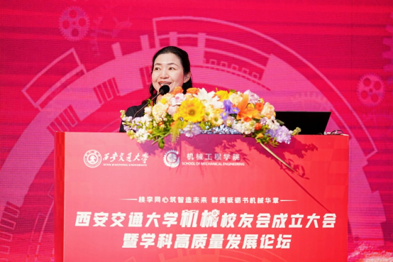 机械校友会荣誉会长、1982级校友、中国科学院院士乔红研究员通过视频为校友会成立送上祝福和寄语。她表示,机械校友会的成立顺应了广大校友师生的热切期盼,承载了校友们对学院的深厚情谊;呼吁广大校友师生在学院和校友会的凝聚下,传承弘扬西迁精神,在为党育人、为国铸器的宏伟事业中携手书写最绚丽辉煌的“机械篇章”。